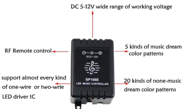 این کنترلر برای کنترل انواع لامپ های LED استفاده می شود. به عنوان مثال: نور منبع نقطه ای، نور نوار انعطاف پذیر، وال واشر دیواری، نور دیوار پرده شیشه ای و. . . از جمله مزایای کنترلر موزیکال IR می توان به کم هزینه بودن، اتصال راحت و استفاده آسان نام برد. همچنین می توان روشنایی، رنگهای ثابت و جلوه های تغییر رنگ را از طریق کنترل از راه دور مادون قرمز تنظیم کرد. وقتی در حالت کنترل صدا باشد، رنگ ها با ریتم موسیقی تغییر می کنند.