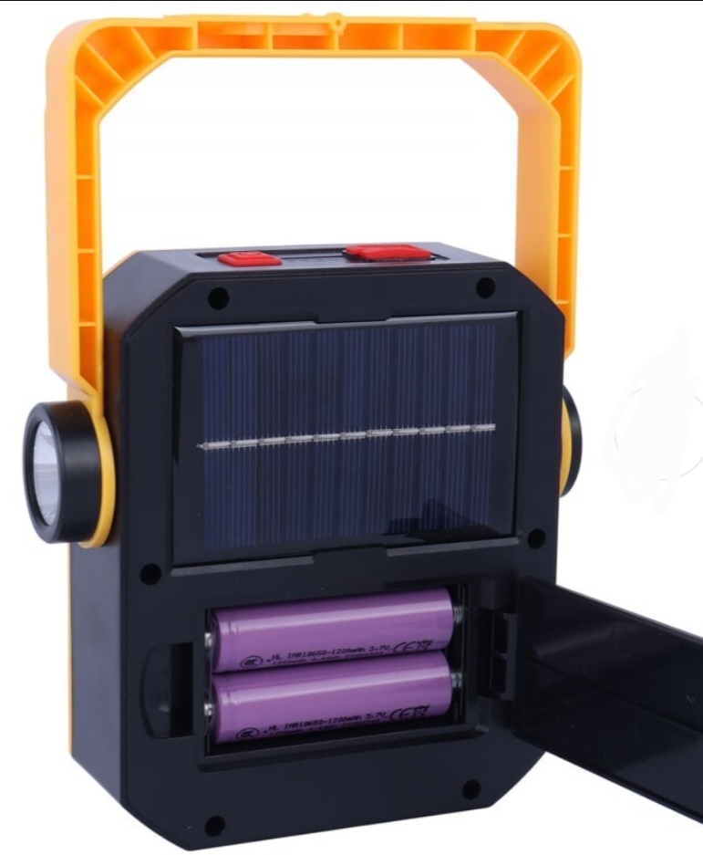 دارای پنل شارژ خورشیدی برای شارژ بدون نیاز به برق، دارای دو عدد باتری لیتیومی 18650 با ظرفیت 2400 میلی آمپر ساعت