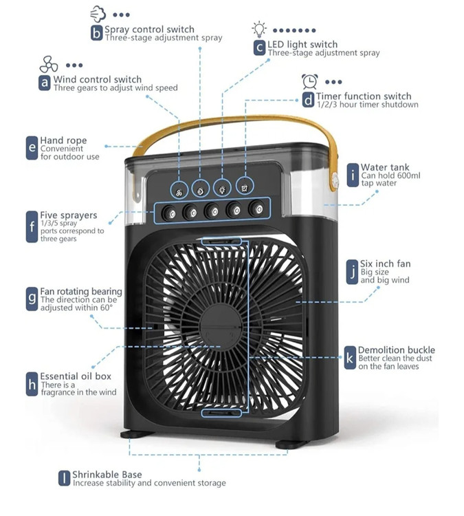 دارای مخزن آب با ظرفیت 600 میلی لیتر با قابلیت مه پاشی، مدت زمان اسپری کردن آب در حدود 2.5 الی 12 ساعت