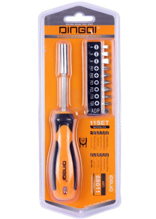 شامل یک عدد دسته پیچ گوشتی و 10 عدد سری پیچ گوشتی شامل سری های دو سو 4،5،6 و سری های چهارسو PH1، PH2 و سری های ستاره ای T15، T20 و سری های PZ1، PZ2، ADP